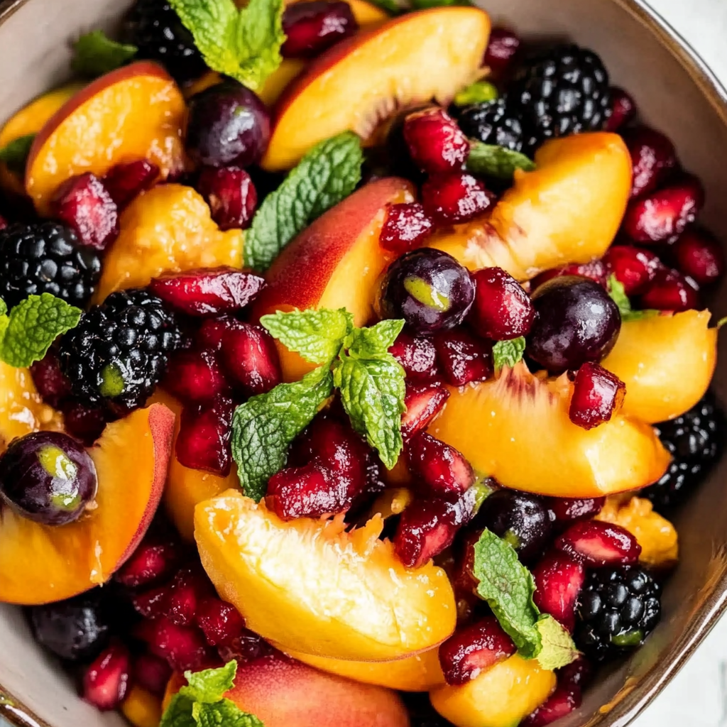 - In a large bowl, combine the sliced peaches, blackberries, blueberries, pomegranate seeds, and basil leaves.